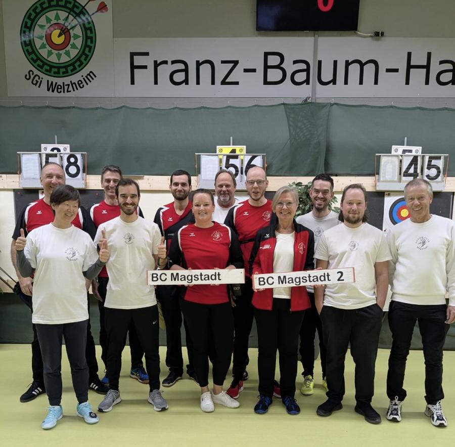 Mit BC Magstadt 1 sammelt sich wieder eine Truppe von routinierten und erfahrenen Schützen mit dem klaren Ziel den Abstieg aus dem letzten Jahr wieder gut zu machen. Das zweite Team aus Magstadt, bestehend aus diesjährigen Anfängerschützen, feiert als bunte Truppe zusammen mit Trainerin das gemeinsame Debüt. Dabei waren von Holzbogen bis Metallbogen ohne Klicker jede Ausbaustufe von Recurvebögen unter den Teamschützen vertreten.